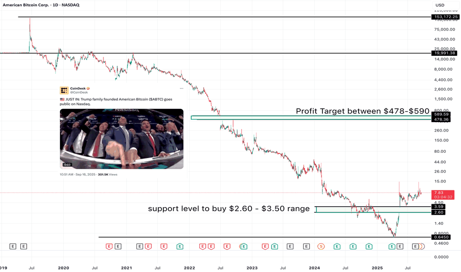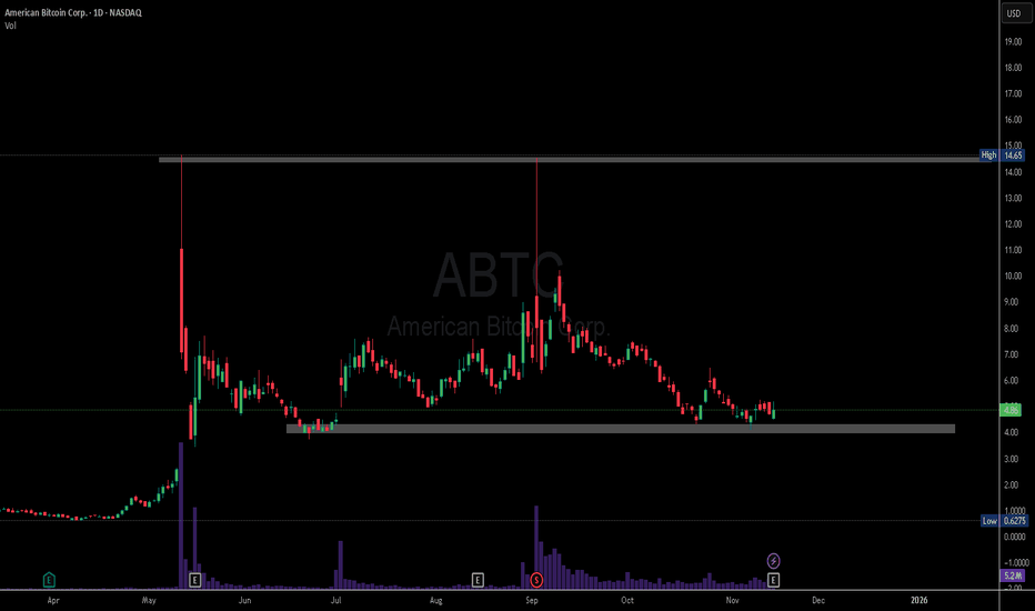 ABTC Long Setup. Can things get any crazier? American Bitcoin Corp. (ABTC), founded by the Trump family and recently listed on Nasdaq, is positioning itself as both a large-scale miner and a Bitcoin treasury company. With ~2,400 BTC already on its balance sheet and backing from Hut 8 Mining, ABTC combines mining revenues with long-term Bitcoin