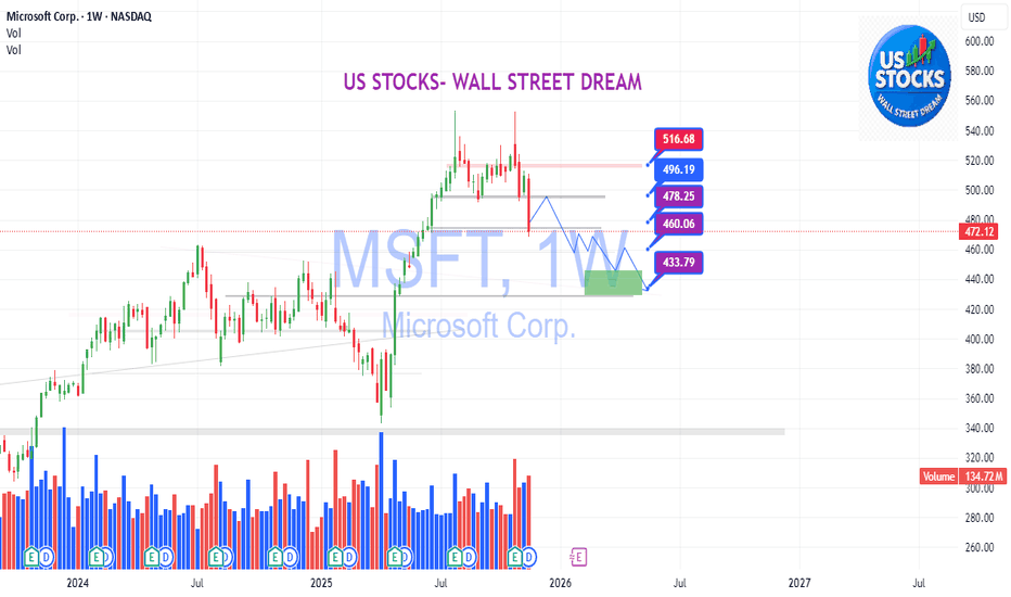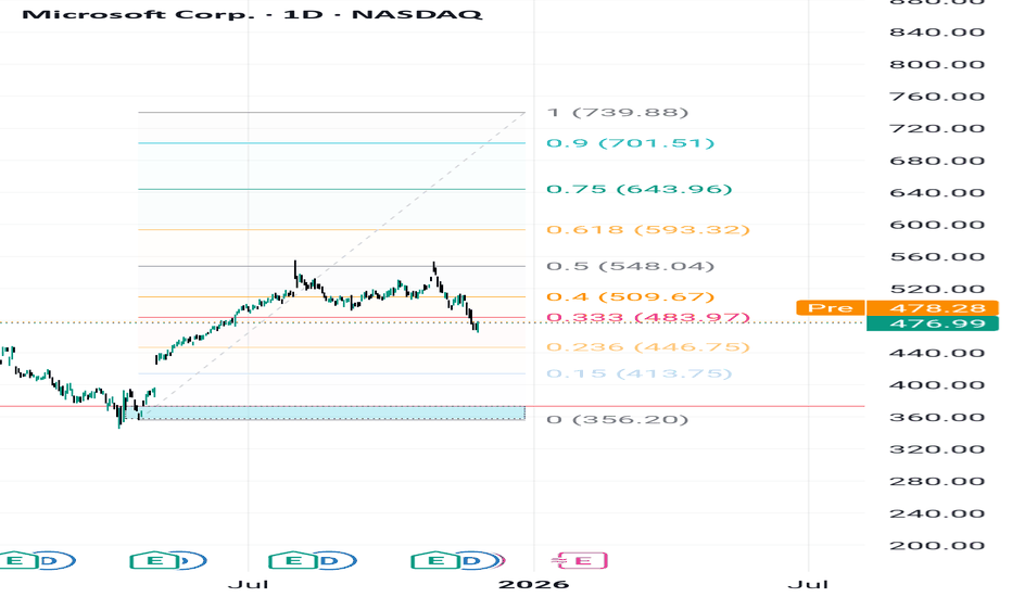 MSFT — Bullish Structure Intact Above 373.22, Targeting 739.88.Microsoft remains in a well-defined long-term bullish structure despite the current pullback from the 0.40–0.50 Fibonacci resistance cluster. The recent decline appears corrective in nature and does not signal any structural weakness as long as the stock preserves its main support foundation.