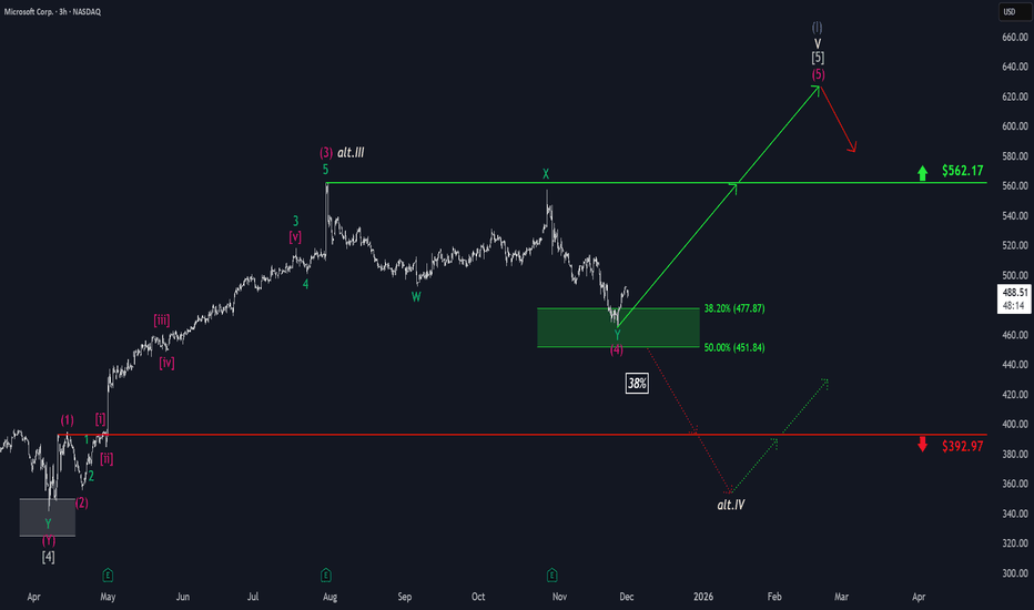 Microsoft: Target Zone Hit!Microsoft has reached our green Long Target Zone between $451.84 and $477.87 as anticipated. In the meantime, the stock has successfully completed the magenta wave (4) and has since broken out of the Target Zone to the upside. We now expect further gains as wave (5) unfolds, targeting a move above t