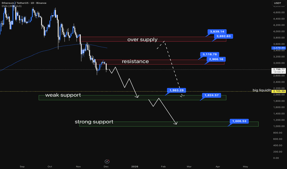 ETHUSDT /// 2DECEthereum lately has been showing signs of weakening after losing the support area around $3400–$3600. With this break, the market structure has shifted toward a more bearish tone, meaning the asset may continue forming lower highs and lower lows as long as downward momentum remains dominant.