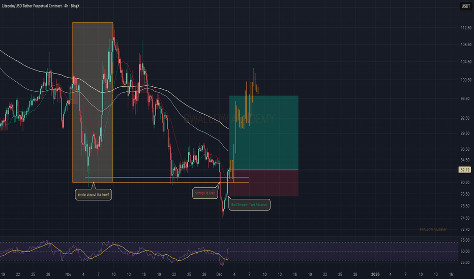 Litecoin (LTC): Seeing Similar Pattern | Bart Simpson PushLTC pulled a strong liquidity grab and instantly recovered with a classic Bart-Simpson type move — very similar to the playout we had earlier in November. If buyers manage to hold this recovery structure and keep pushing above the EMAs, we could see another upside leg forming the same way.