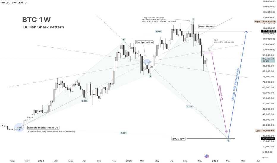 BTC Bullish Shark Pattern: DCB or Moon?BTC 1W – Bullish Shark forming. After the ‘total unload’ and a potential liquidity sweep into the 2022 lows (final D leg), I’m looking for the ultimate reversal that could launch the new epic parabolic leg toward 100k+ and a full‑blown altseason