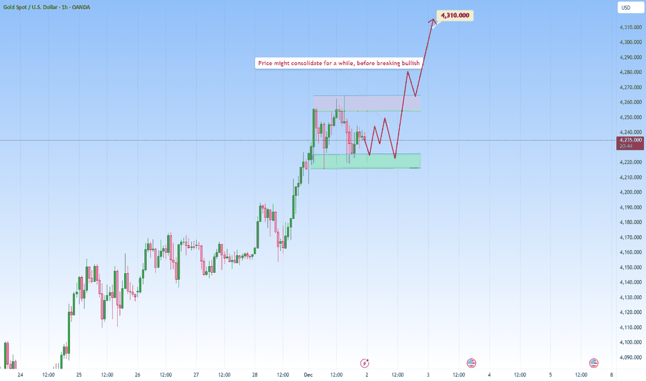 My preferred scenario: XAUUSD may continue oscillating between 4,220–4,310, where spikes toward 4,30 tend to trigger selling, while dips to around 4,22 draw in buyers. As long as price does not clearly break out of either boundary, I consider this a sideway market within a larger bullish structure , ideal for trading the range rather than trying to predict the next breakout.