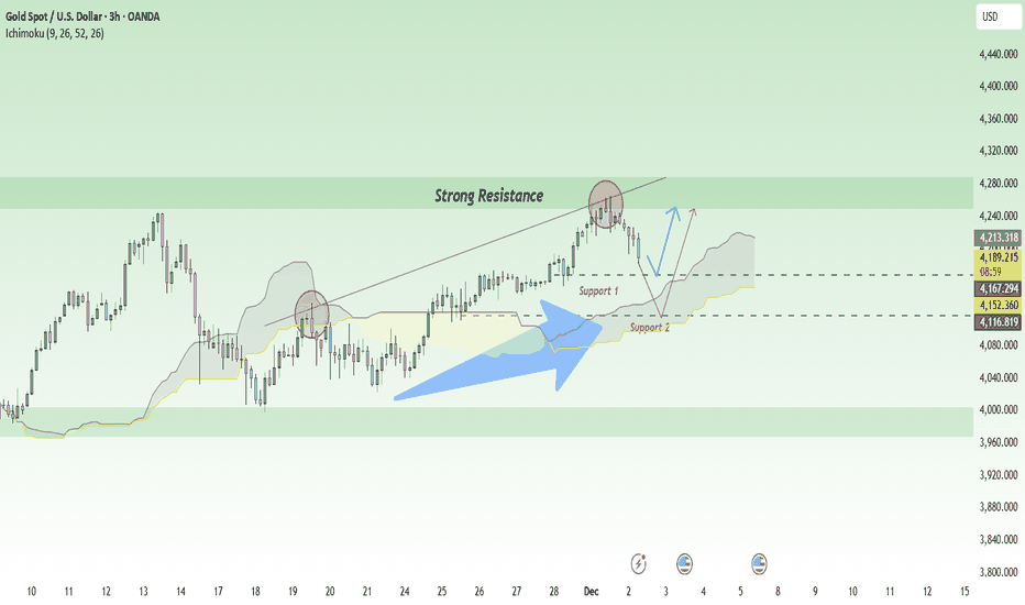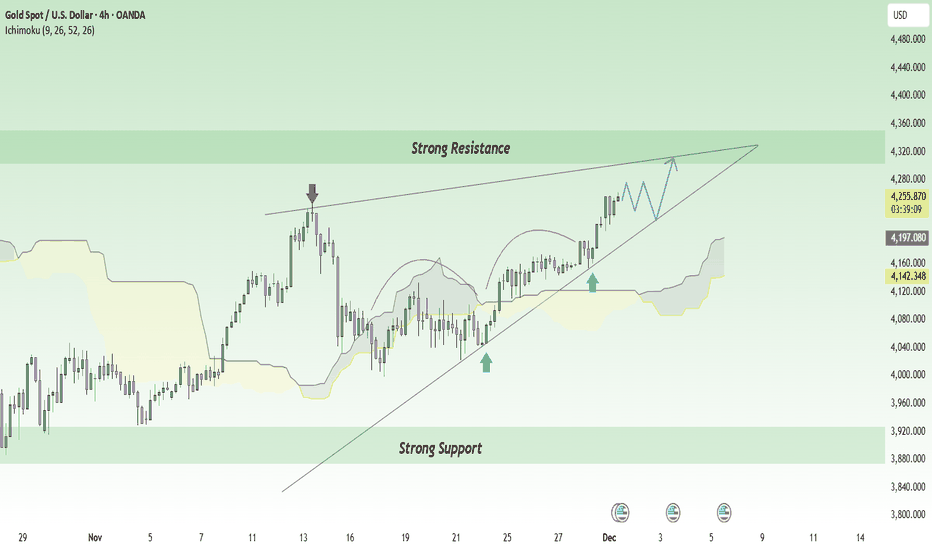 On the H4 chart, gold is pressing against the upper trendline, right at the 4,300–4,310 resistance zone , while support sits below at the 4,220 level overlapping the rising trendline and the Ichimoku cloud . These two areas form a natural “price box”: the top attracts profit-taking from buyers, the bottom attracts fresh dip-buyers — a classic setup for a healthy sideway accumulation phase.