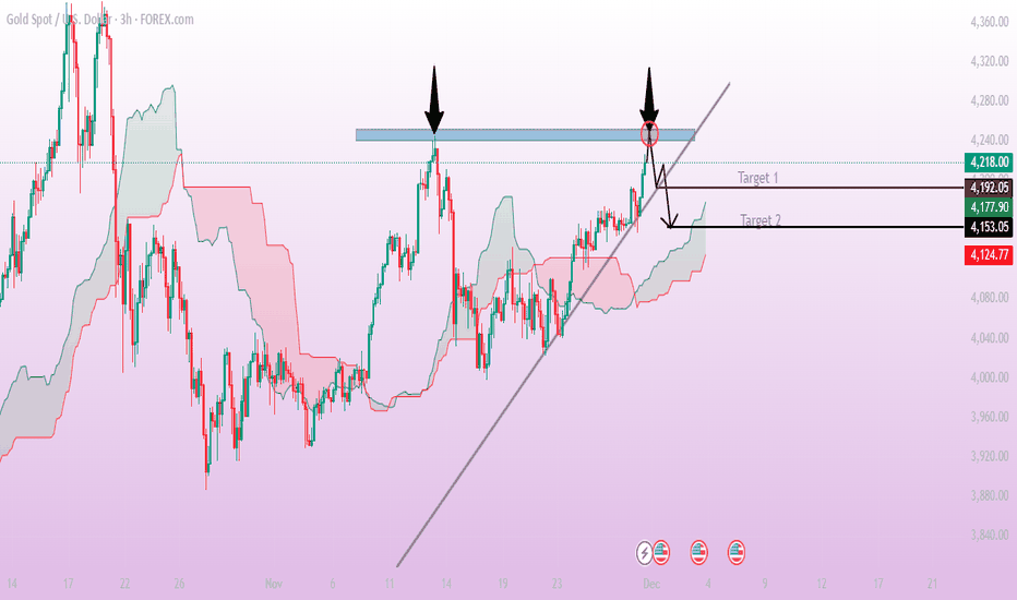 XAUUSD Market Outlook — Targets AheadThe XAUUSD chart shows price reacting strongly from a major resistance zone highlighted by the blue area, where price has previously reversed. After retesting this resistance again, price formed a rejection candle, signaling a potential short-term pullback. The market is still respecting the ascending trendline, but a break below it would confirm downside momentum. If price fails to break above the resistance zone, the bearish correction may continue toward the marked support levels. Target 1 is 4,192, where initial support and minor structure align. A deeper move could extend toward Target 2 at 4,153, which matches previous demand and cloud support. A break below these levels may open the way toward lower zones.