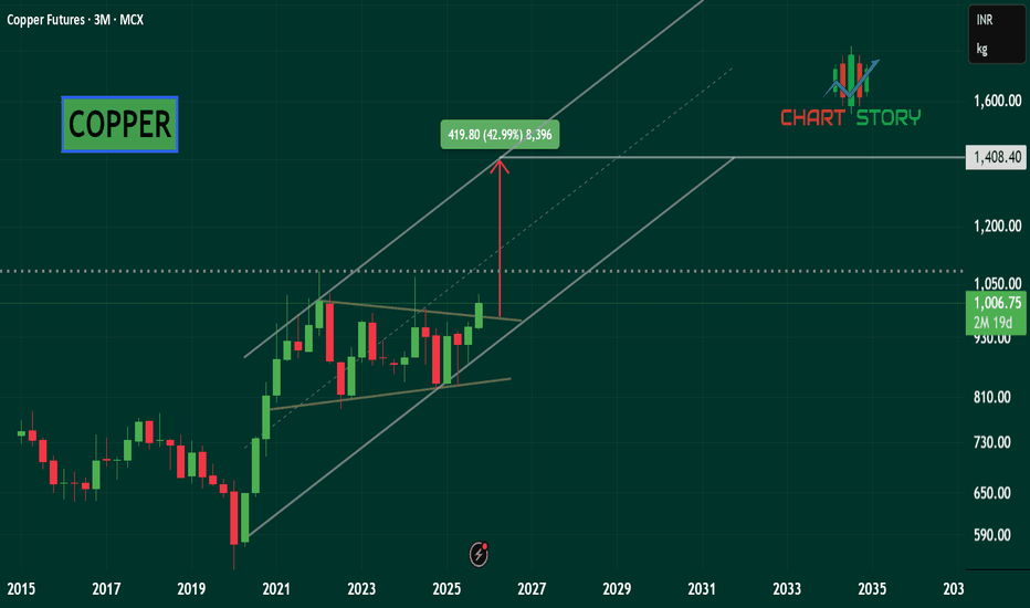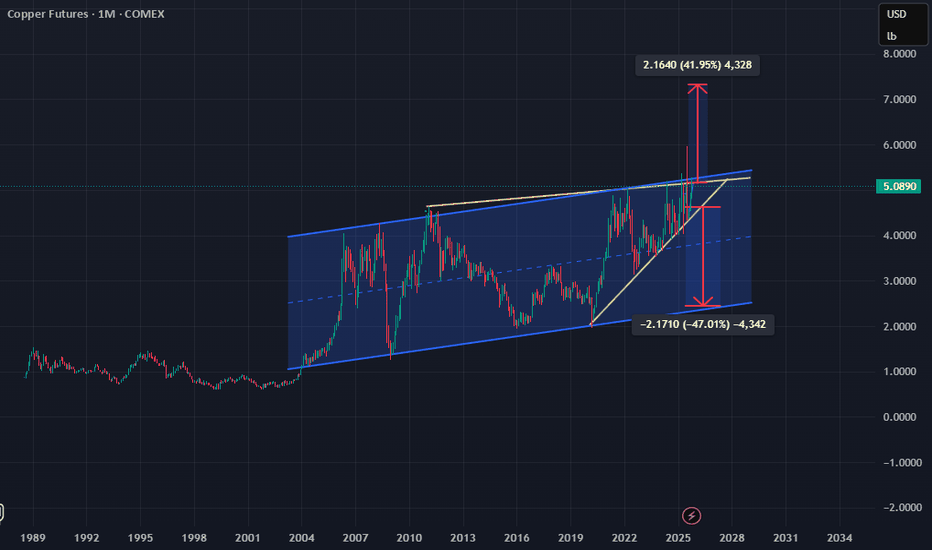 Dr. Copper breakout or breakdown?Copper has been in a channel for around 23 years. The wedge pattern that has formed over the years will come to a decision point in the next few months. My money is on copper staying in the channel. That is to say, the weakness in the economies of Europe, the US, and China will deteriorate into o