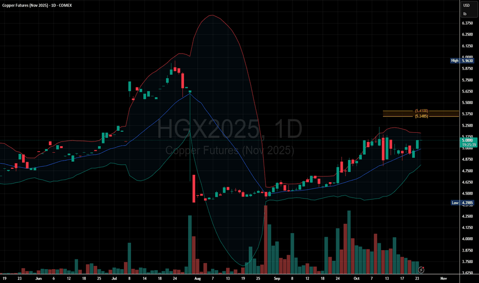 Copper Futures (Nov 2025) is showing renewed bullish strength as price sustains above the 50-day moving average and approaches the upper Bollinger Band.