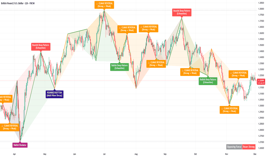 B. The Climax Reversal (The Trap)This is the "Aggressive" entry, catching V-shape reversals.Wave 1 $\rightarrow$ 2 (The Bait): Price pushes higher, and momentum is Stronger/Higher (No Divergence). This sucks in retail traders who believe the trend is accelerating.Wave 2 $\rightarrow$ 3 (The Snap): Price pushes again, but momentum suddenly collapses (Divergence).The Logic: A "Strong to Weak" shift. The market traps traders with a show of strength before hitting a "concrete wall" of limit orders.C. The Predator (The Trend Continuation)The Logic: Trends rarely move in straight lines. The "Predator" looks for Hidden Divergence during a pullback.The Signal: Price makes a Higher Low (Trend Structure Intact), but Momentum makes a Lower Low (Oversold Trap). This signals the end of the correction and the resumption of the main trend.3. The "Clean Path" PrincipleA trade is only valid if there is no opposing force. If you are looking to Sell (Bearish Reversal), the opposing Bullish momentum must be weak or neutral. If the "Enemy" is strong, the trade is skipped.