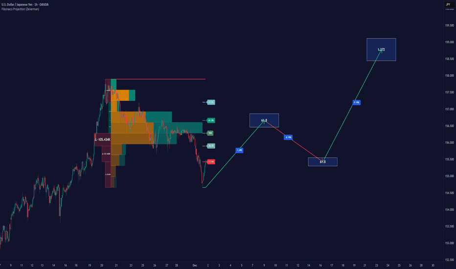 The indicator first detects the most recent swing high and swing low using the Period setting. That swing defines the Fibonacci range, from which the script draws retracement levels (0.236–0.786) and builds a forward projection path using the chosen Projection Level and a 1.272 extension.