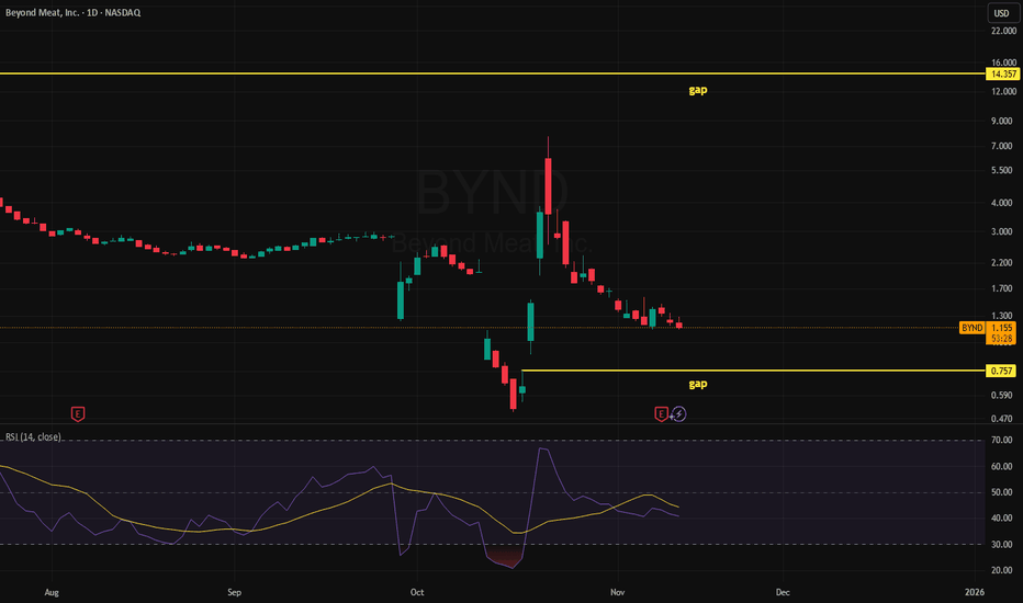 BYND Frustrating GamblersBYND is frustrating all the shareholders, many of whom have been expecting short squeeze activity. Share price is still mired in a steady decline. Gaps sit at $14.35 and $0.75. It's likely the $0.75 gap fills before $14.35. Short interest reports have been in disagreement, widely, with reliable repo