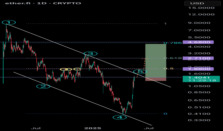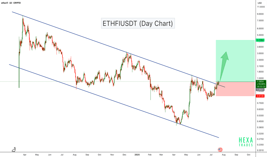 ETHFI Breaks Out of Descending Channel – Bullish Rally Ahead?ETHFI has been trading inside a descending channel for over a year, consistently respecting both resistance and support levels. Recently, the price broke above the channel resistance with strong bullish candles, suggesting a potential trend reversal.