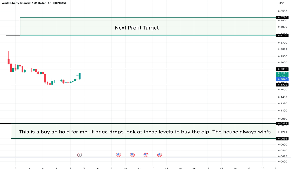 The House Always Wins: WLFI LongThis is a buy and hold for me. Price has respected the $0.1739 support and is pushing back toward the $0.2305 resistance. If price dips, I’ll be watching $0.1739 and $0.0871 as key buy-the-dip levels.