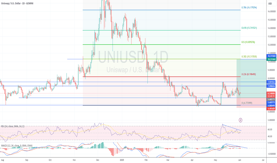Uniswap (UNIUSD) is currently testing crucial support at **$5.80Uniswap (UNIUSD) is currently testing crucial support at **$5.80**, a level that has served as both psychological and technical support since January 2024. The price remains confined below key moving averages (50-day at **$6.40**, 200-day at **$7.10**), reflecting persistent bearish pressure. Tradin