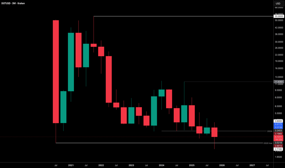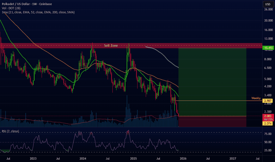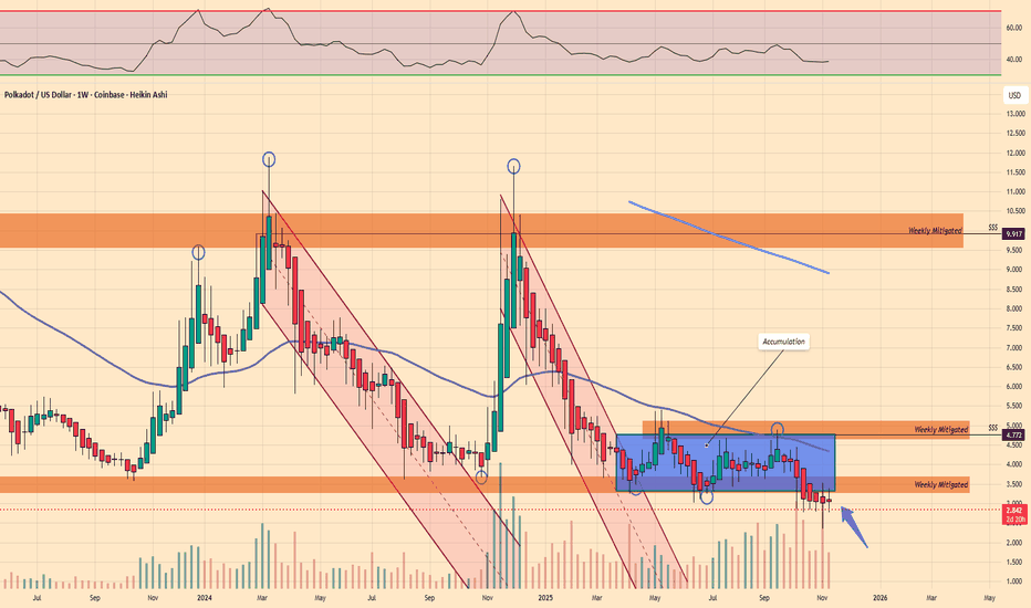 $DOT / Polkadot - Life SupportWith price coming out of the accumulation range in a downtrend and collapsed under weekly mitigated support/demand.