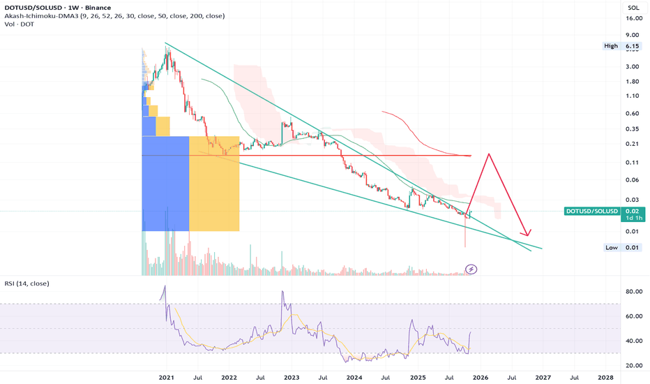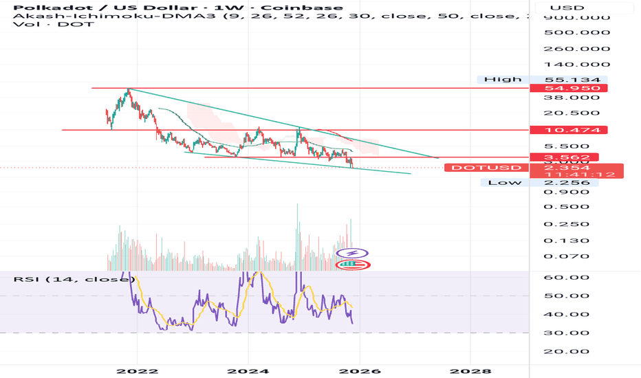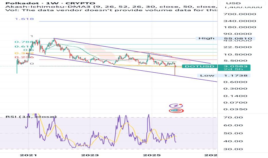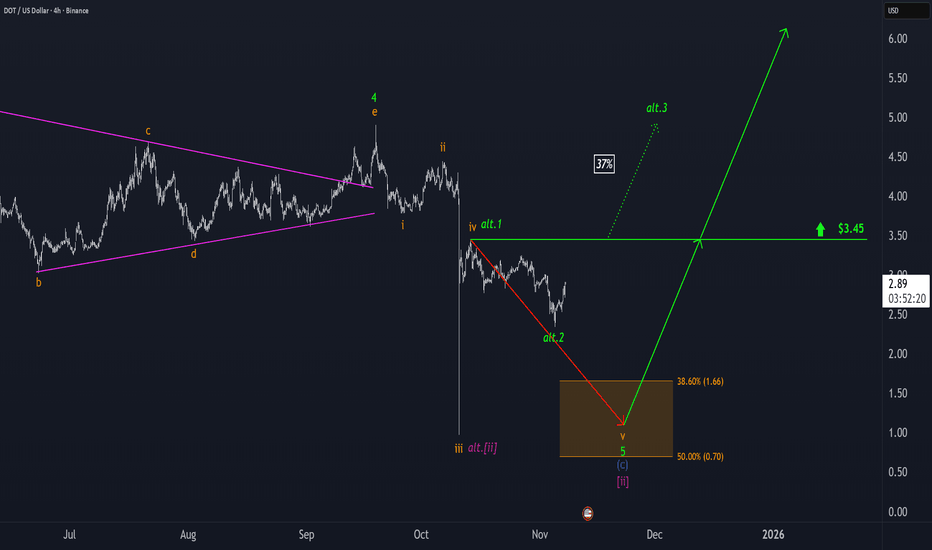 Polkadot: Ready to Bounce Straight Back Up?For now, we continue to expect that DOT will be sold off into our orange Target Zone between $1.66 and $0.70—which could offer attractive long entry opportunities – and complete magenta wave . However, we estimate there’s a 37% chance that the significant low is already in place and that the altcoi