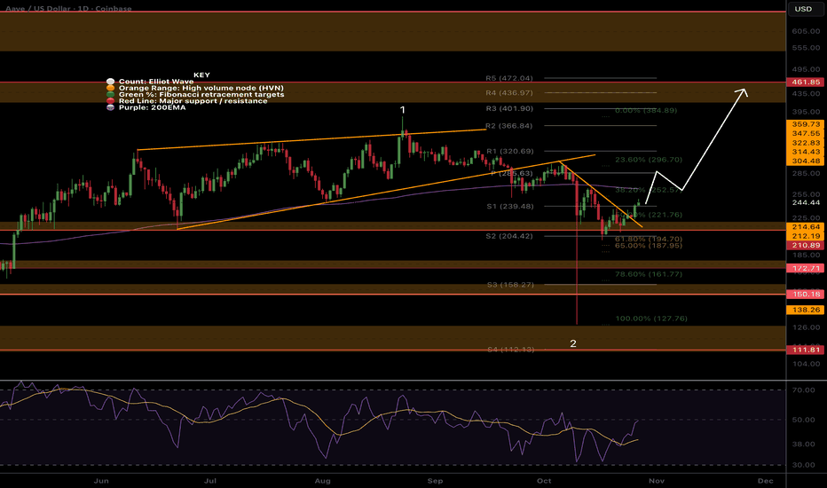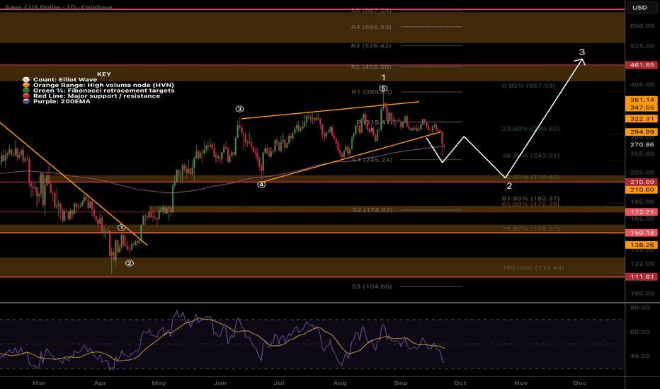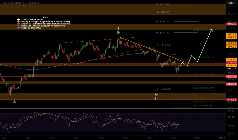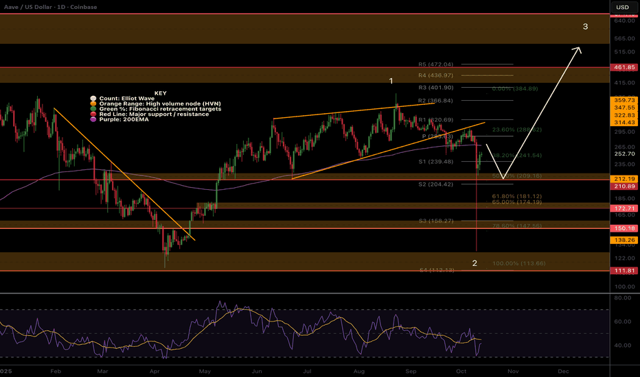 CRYPTOCAP:AAVE broke down out of the wave (5) of 1 wedge per my previous analysis reaching the paths first target to find support the daily 200EMA and S1 pivot point. If price continues lower I expect it to bounce first before delivering a final thrust down