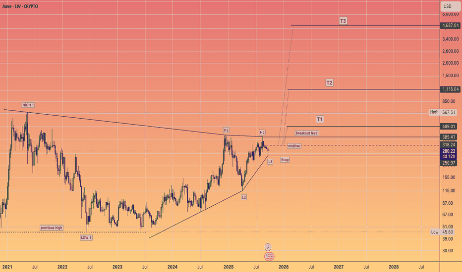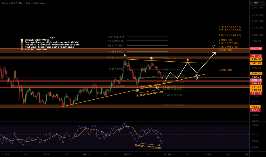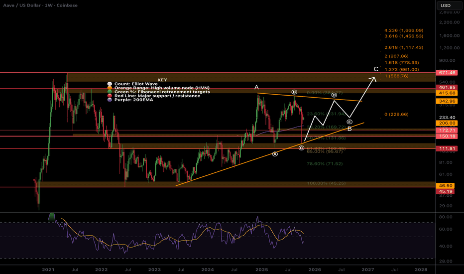AAVE Macro changed... Another huge triangle?EURONEXT:AAVE macro has changed with the recent price action. We appear to printing a multi-year macro triangle in wave B, with wave (C) now complete on last weeks wipeout.