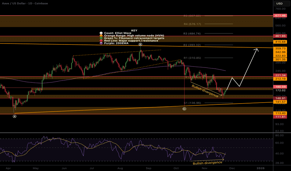 AAVE Macro outlook, weekly bullish divergenceA price range between $440 and $130 continues. Price appears to have completed triangle wave (c) of a larger wave B. Wave (D) is next, with a target of the upper boundary trend-line ~$340.