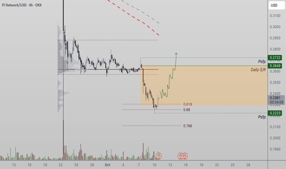Pi Network Rebounds from Golden Pocket — Is a Reversal Brewing?Pi Network (PI) is showing early signs of strength after rebounding from the 0.618 Fibonacci retracement level, accompanied by a bullish engulfing candle on the 4H chart. This confluence zone marks a crucial turning point where buyers are beginning to re-enter the market following an extended phase