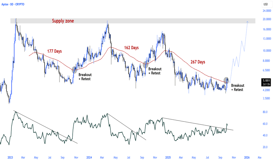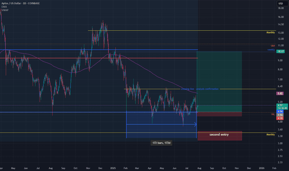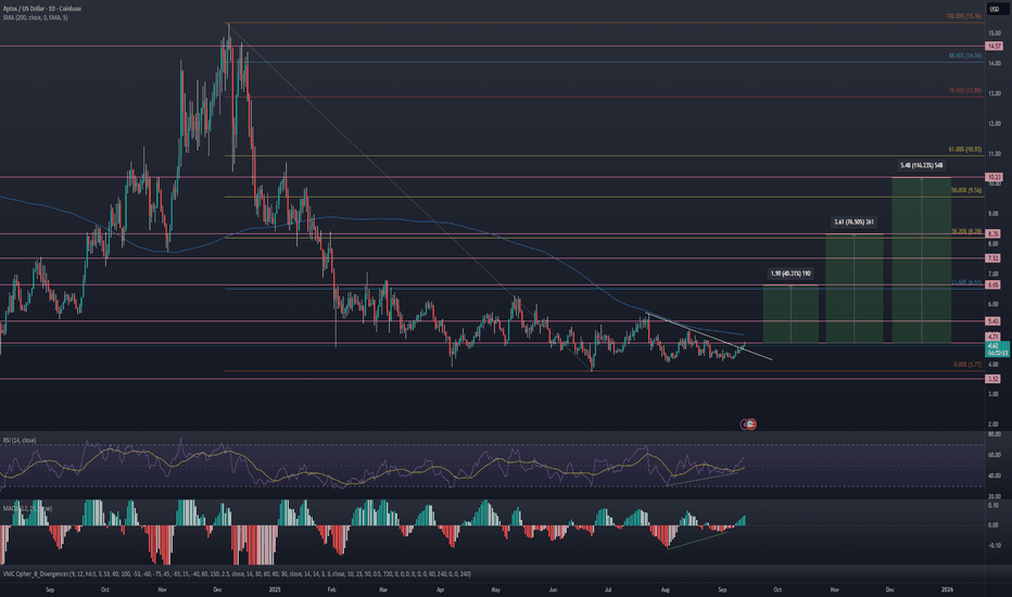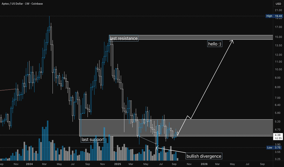 Aptos Bullish Divergence: Targeting $4.3–$15 Range Aptos has stabilized above the last weekly support; currently, there is a bullish divergence on the weekly chart, so all signals point to a likely upward push. The current range to play is $4.3–$15, and the risk-reward in this case is really good. Thanks to everyone for your attention.