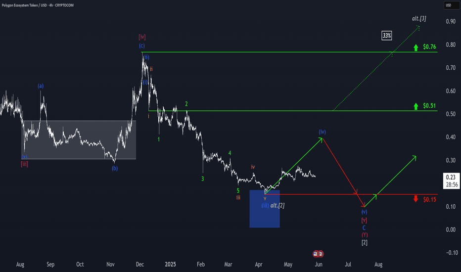 Polygon: More (short-term) Upward PotentialFor Polygon’s POL, we primarily expect further corrective rises during the blue wave (iv), but below the $0.51 mark, renewed sell-offs should take over. These declines should then drive the price down below the support at $0.15, allowing the large wave to reach its conclusion there. Our alternativ