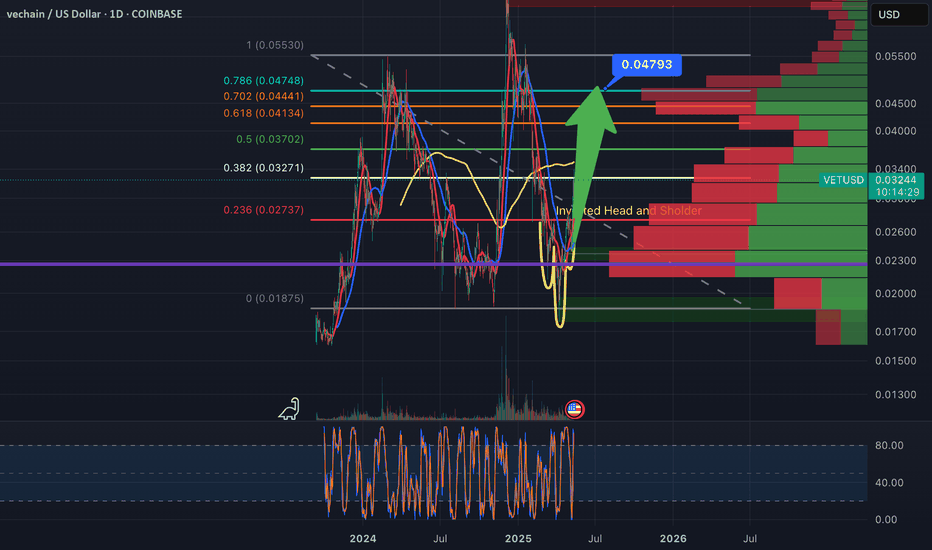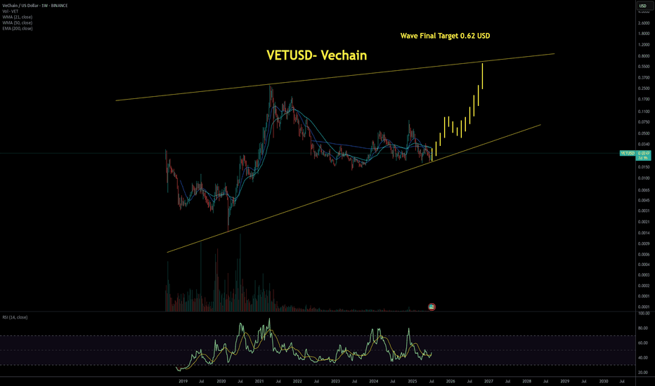 VETUSD – VeChain’s Wave Finale: Road to $0.62VeChain (VETUSD) is showing bullish intent with momentum accelerating out of a defined trend channel. I would like to highlight the technical analysis suggesting a potential wave culmination at the $0.62 mark—a sharp leap from its current price of $0.0247. Backed by strong volume and RSI movement, t