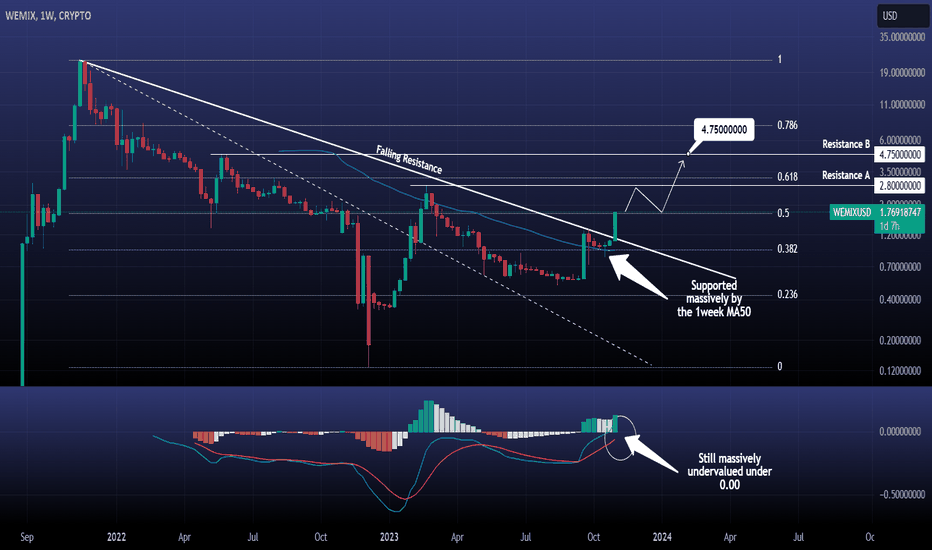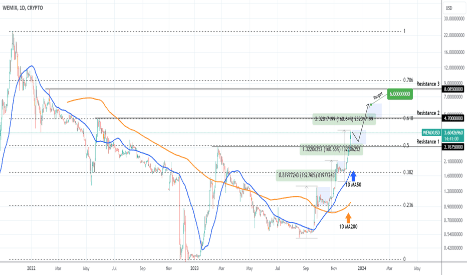 WEMIXUSD Major bullish breakout and it's not finished yetWemix / WEMIXUSD is having the strongest 1week candle since September 18th when it crossed over the 1week MA50 and turned it to Support (closed all candles over it).