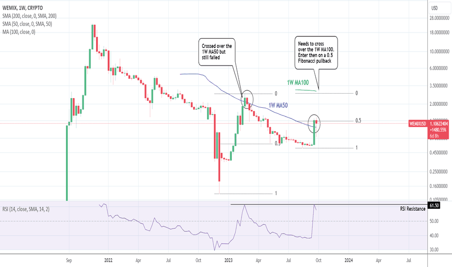 WEMIXUSD Bull Cycle still not confirmed.WEMIXUSD had the biggest 1W bullish candle last week in 2023 turning the 1W technical outlook bullish (RSI = 59.545, MACD = -0.041, ADX = 41.950) and the 1D RSI extremely overbought. A lot of traders will understandably rush to buy on this level especially since the price crossed over the 1W MA50, b