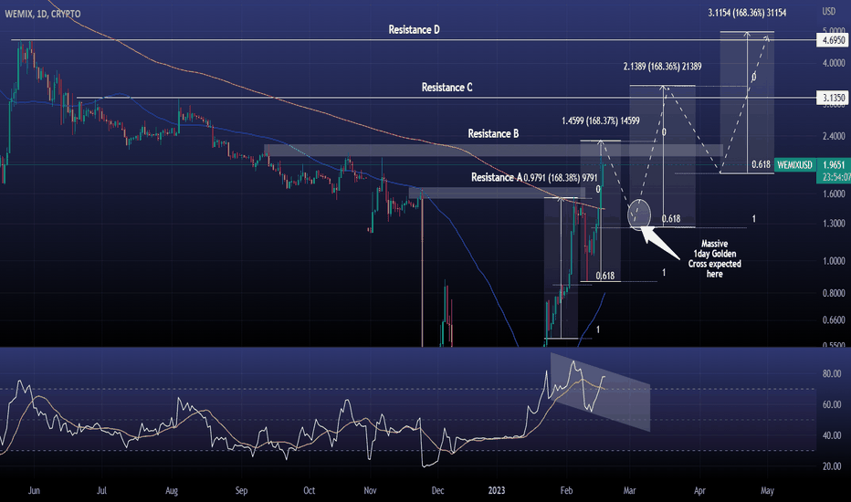 WEMIXUSD This is how it reaches $5.000WEMIXUSD has been on an incredible 1 week rally and is near hitting Resistance B. The previous High of Wemix's +168.38% rally stopped after filling the gap on Resistance A and pulled back to Fibonacci 0.618. As the 1day RSI is bull flagging, we expect Resistance B to be fully tested on another appro