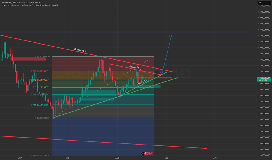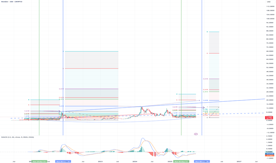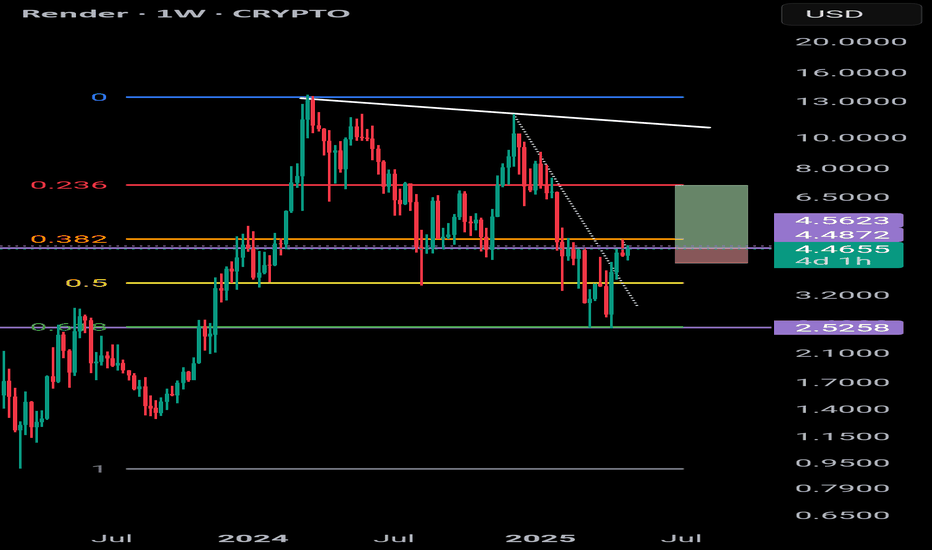 RENDER conditional longRENDER appears to be reacting to the fibonacci levels. Currently finding resistance @ the 382. If price starts to break above this level I believe the next natural step would be the 236