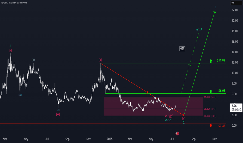 RENDER: Is the Correction Over?RENDER has surged nearly 20% at its peak recently. This prompts the question of whether the wave 2 correction low may already be in place. We continue to consider this scenario as our alternative outlook, in which we would anticipate direct gains above the resistance levels at $6.08 and $11.82 (prob