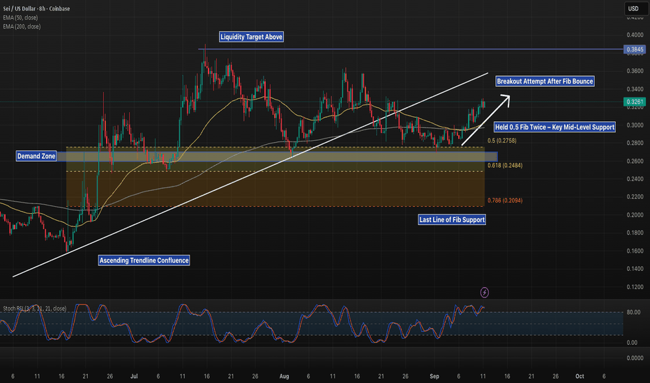 SEI 8H – Breakout After Fib Defense, Targeting Liquidity SEI has respected multiple Fib reactions, holding the 0.5 retracement ($0.2758) and defending the golden pocket ($0.2484) on prior dips. Price has since reclaimed both the 50 EMA ($0.302) and 200 EMA ($0.297) while riding the ascending trendline for confluence.