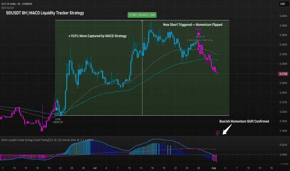 SEI - MACD Liquidity Tracker Nailed the Long, Now Flipping ShortThe MACD Liquidity Tracker Strategy just clocked a +103% long trade on SEI before momentum flipped and a short signal fired on this 8H chart.