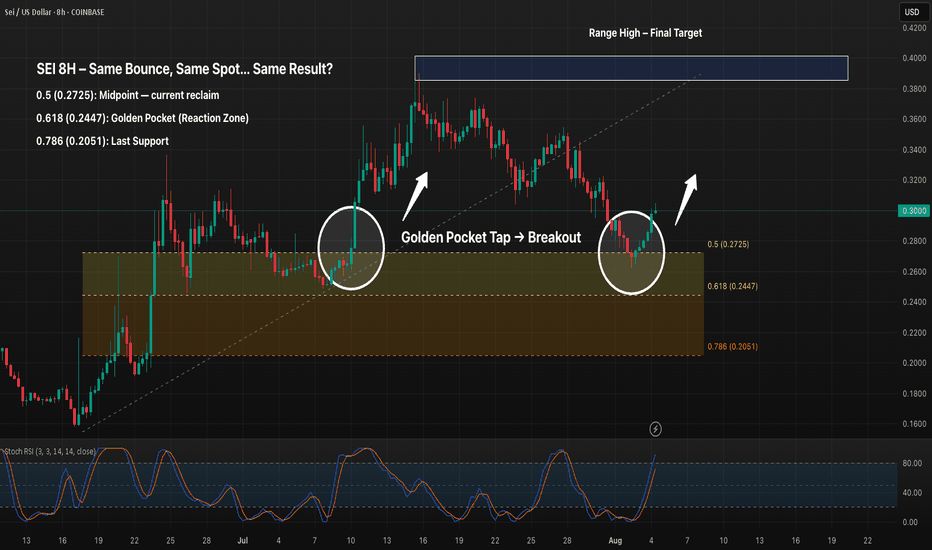 SEI 8H – Same Fib Zone, Same Bounce… Same Outcome?SEI just tapped the exact same golden pocket zone that launched its last major breakout — and it’s already showing signs of a repeat performance. The 8H chart displays a nearly perfect mirror setup, with price double-tapping the 0.5–0.618 retracement zone and bouncing with momentum.