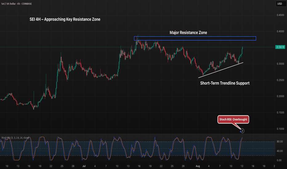 SEI 4H – Testing $0.39 Resistance After Trendline RallySEI has rallied sharply from its ascending trendline, pushing toward the $0.39–$0.40 resistance zone that capped previous highs. The Stoch RSI is deep in overbought territory, suggesting possible consolidation or a minor pullback before any breakout attempt. A confirmed move above $0.40 could target