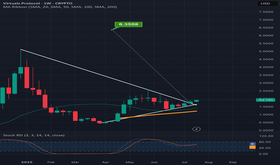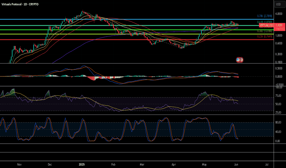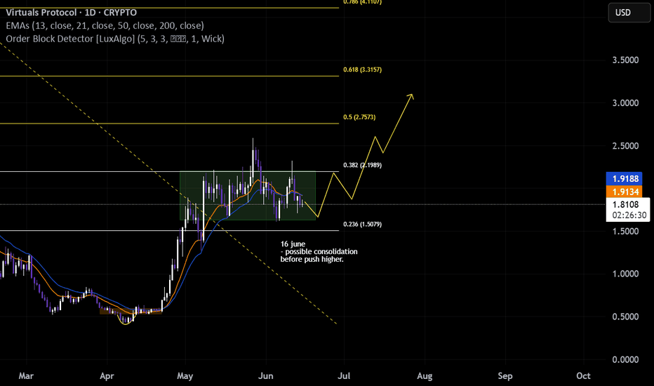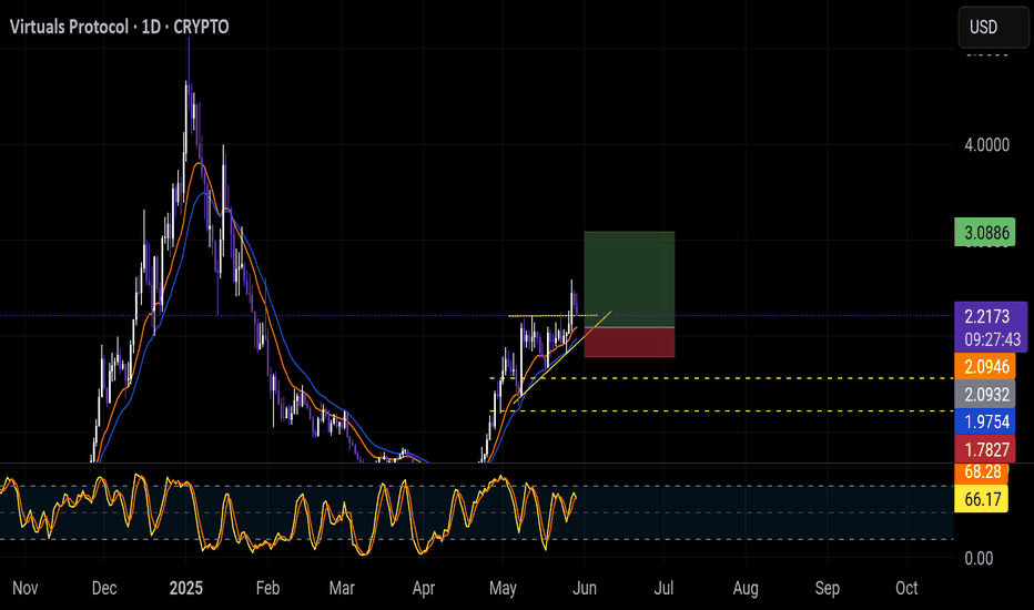 Virtuals Protocol Potential Bullish Breakout OpportunityVirtuals Protocol seems to exhibit signs of overall potential Bullish momentum if the price action breaks the previous prominent Higher High with multiple confluences through key Fibonacci and Support levels which presents us with a potential Non-Levered buy and hold opportunity.