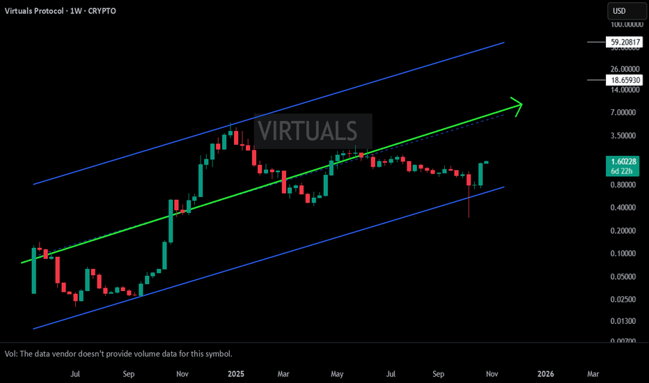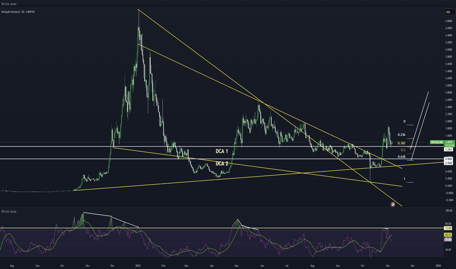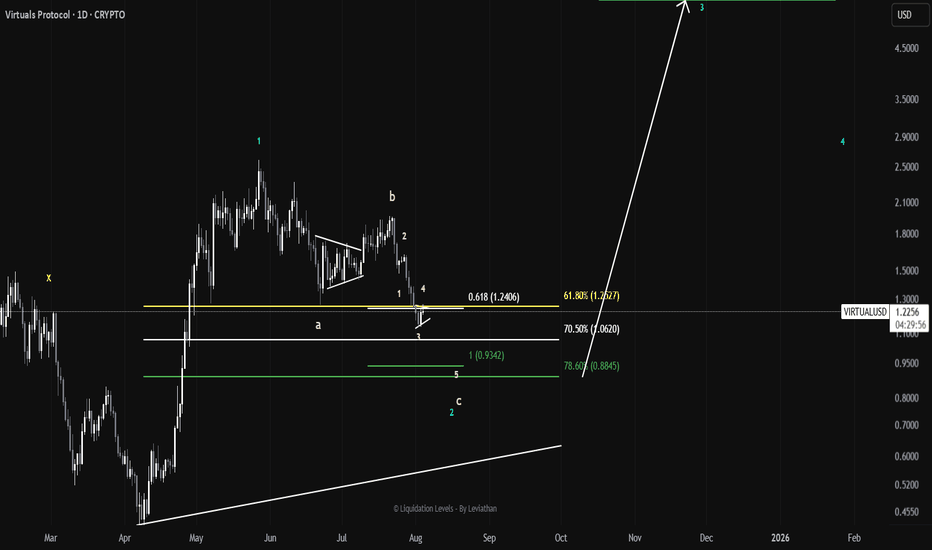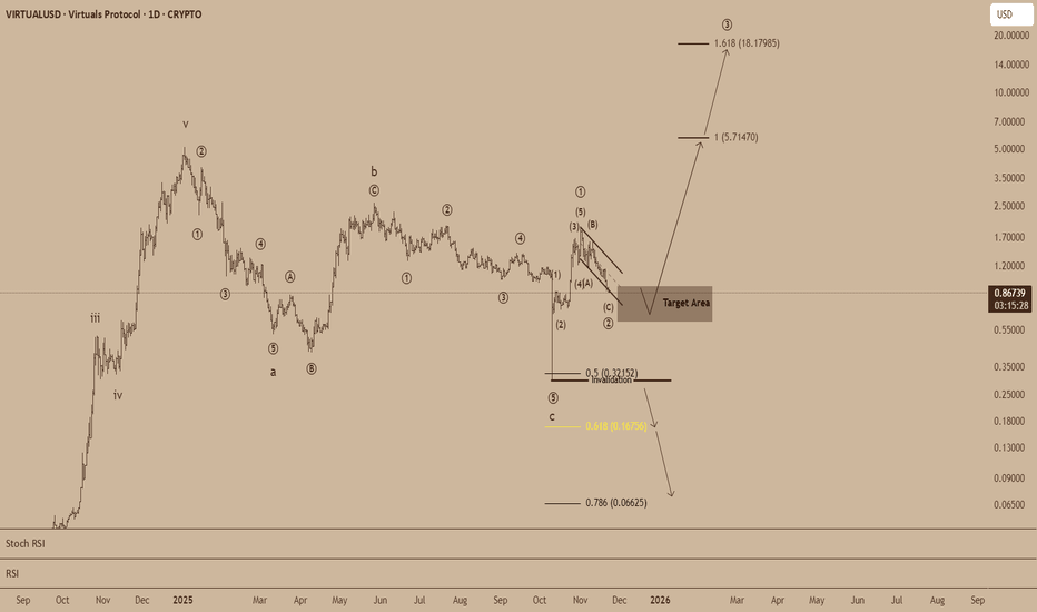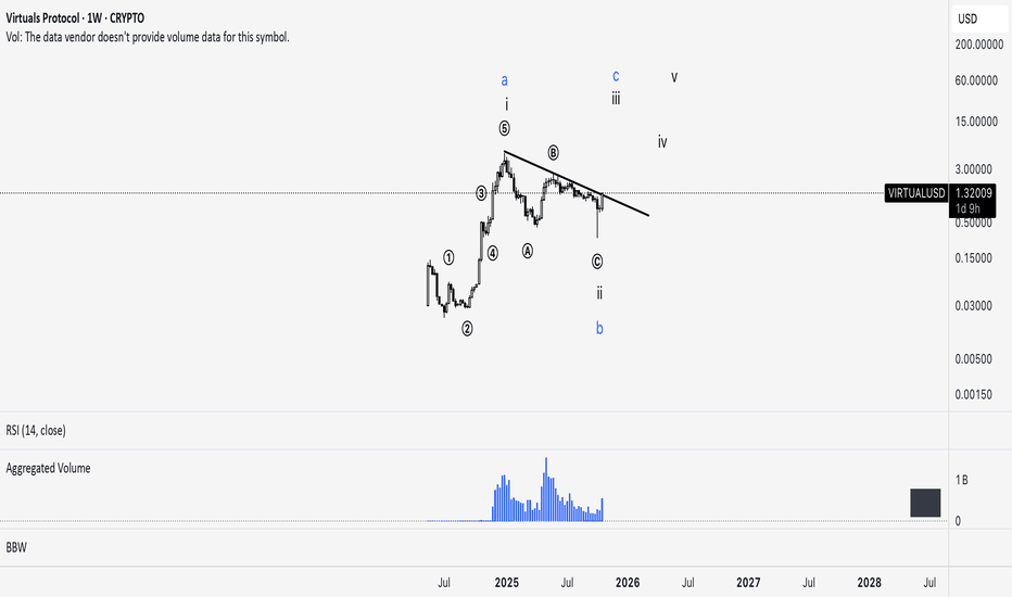 VIRTUALS – wave 3 in progress?VIRTUALS is currently trying to break through its downtrend line with increasing volume. The decline from January to October 2025 can be seen as an ABC zigzag forming wave 2 within a larger impulsive structure. Could this mean we’re just starting wave 3? The risk/reward ratio isn’t very favorable at