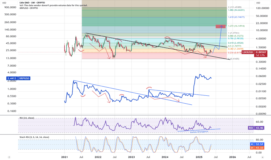 LDO time to move upLDO is bouncing all over but when comparing it with XRP we see same algo in play where we have broken major diagonal resistance line and then made correction back to test it as support. We also have bullish divergence so bounce up is in play. I expect to test 2nd diagonal resistance line, correct a