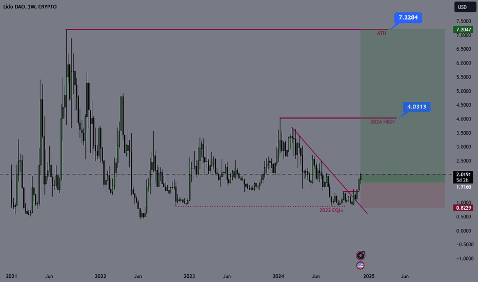 Lido DAO - Buy Idea (Short-term)Lido DAO (LDO) is a decentralized autonomous organization that offers liquid staking solutions, enabling users to stake their Ethereum and other supported assets without losing liquidity. This approach has positioned Lido as a significant player in the decentralized finance (DeFi) ecosystem, providi