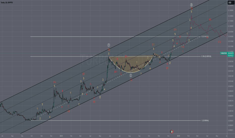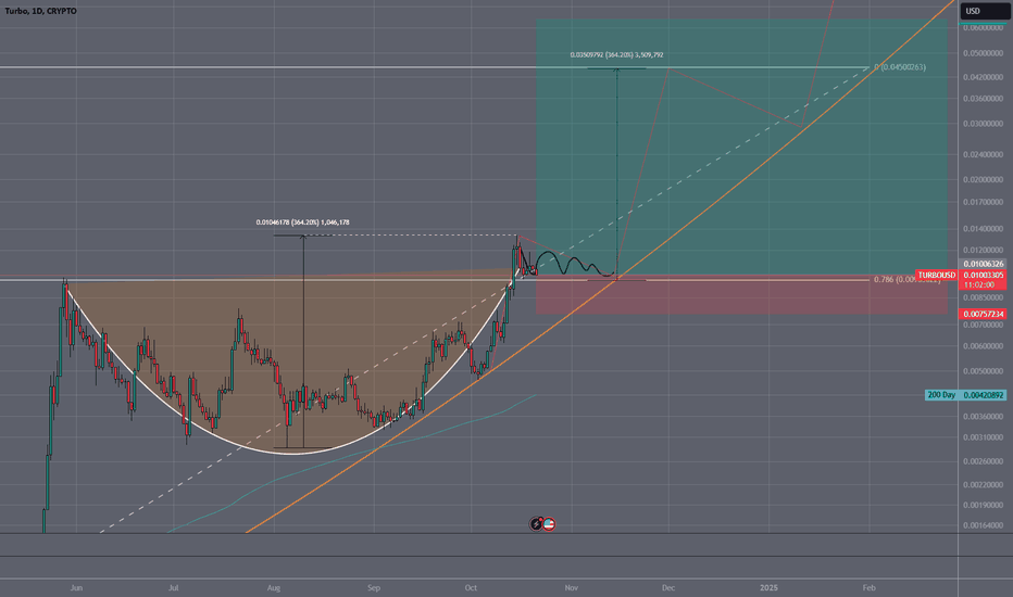 TURBO Cup and Handle FormationThe current cup and handle formation on the logarithmic parabolic trend suggests we'll see a distribution and consolidation phase throughout October. After November 5, the handle is expected to meet the parabola. Measuring the depth of the cup projects a price target of 0.045, which aligns with the
