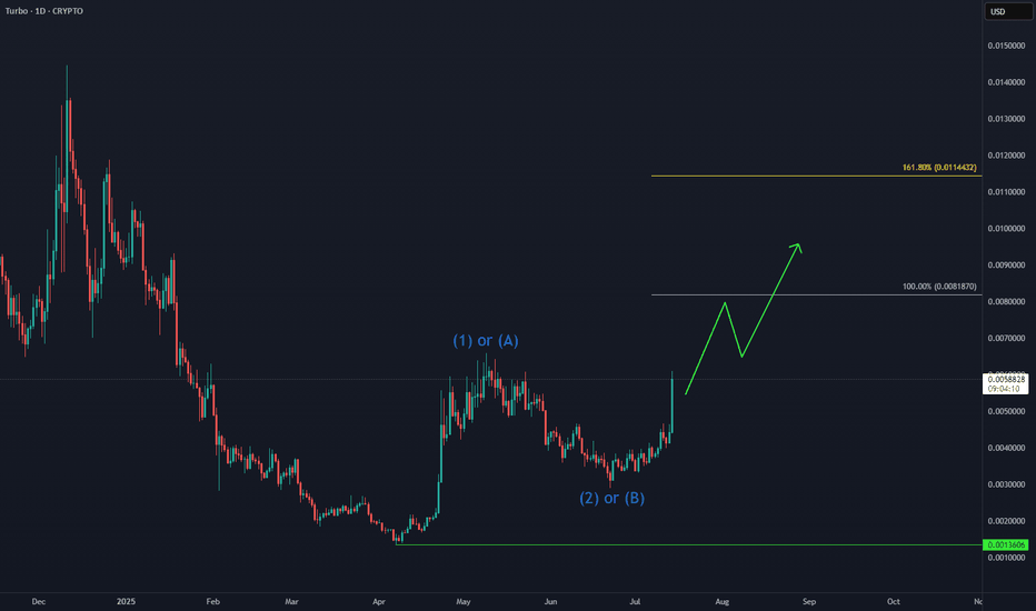 TURBO: Next Leg Higher in Progress📈 CRYPTO:TURBOUSD is building momentum after holding key support levels, with Elliott Wave projections pointing toward the equal legs target zone at $0.008–$0.011. The recent bullish structure suggests continuation, especially following its Binance US listing and strong community backing.