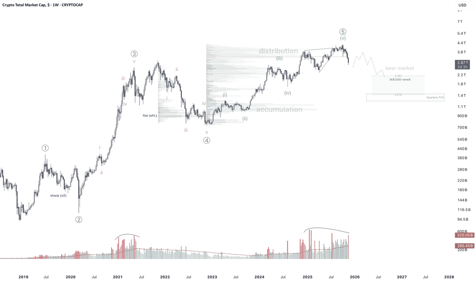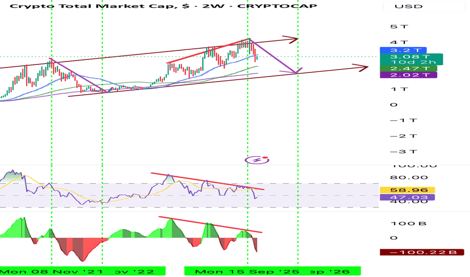End of Cryptocurrency CycleTOTAL1 is approaching a critical inflection point as the entire crypto market cap compresses inside a multi-year rising wedge, with price still grinding higher while internal momentum decisively weakens. The structure shows classic late-cycle exhaustion: RSI has been carving a clean series of lower
