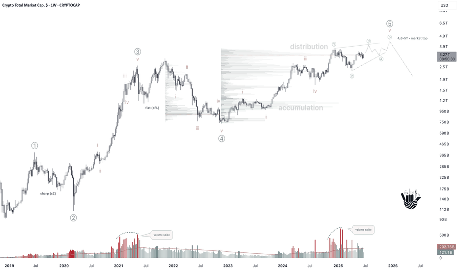 CRYPTOCAP:TOTAL has broadly followed the roadmap from my previous overview , and now we finally have confirmation: five waves up, an ending diagonal, the main volume pool sitting a