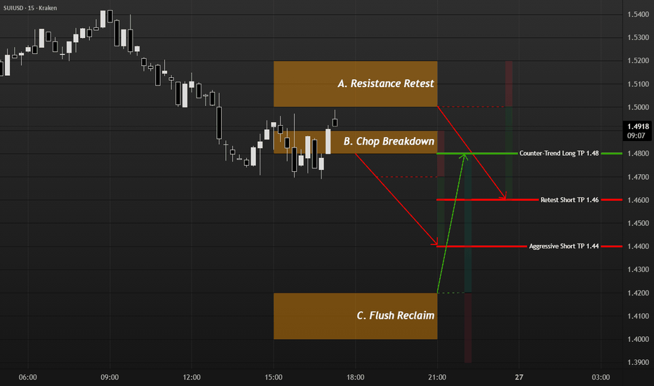 SUI intraday while BTC stallsBTC is chopping at key levels, so I’m not forcing trades there. Instead I’m using SUI on Kraken: strong push up from 1.33 to 1.55 on 24th, then clear distribution and break lower, which gives three structured ideas.