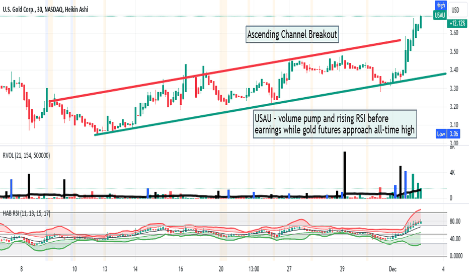 USAU Gold Penny Stock with impeding EarningsUSAU has been in an ascending channel on the 30-minute chart with the rise in spot and future