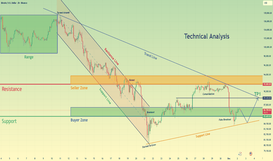 BTCUSD Short-Term Setup: Buyers Defend Support, TP1 at $89,200Hello traders! Here’s my technical outlook on BTC/USD based on the current market structure. After reaching the Seller Zone near $92,000, the price once again faced strong rejection, forming a clear reversal right under the descending Trend Line. This confirms that sellers continue to defend this area and keep Bitcoin within a broader corrective structure. From there, BTC pulled back toward the Buyer Zone around $86,000–$85,500, which has acted as a reliable support multiple times in the recent sessions. The market is now forming a potential short-term recovery after a fake breakout below this zone, highlighting attempts from buyers to regain control. However, as long as the price trades below the Seller Zone and the descending Trend Line, bearish pressure still dominates the chart. The structure suggests that Bitcoin may attempt a move toward TP1 at $89,200, where the market previously consolidated and faced resistance. A clean rejection from the Trend Line could send the price back toward support for another test, while a confirmed breakout above $92,000 would shift short-term sentiment and open the way for stronger bullish continuation. On the other hand, a breakdown below $85,500 could expose BTC to deeper declines toward lower support lines. Please share this idea with your friends and click Boost 🚀