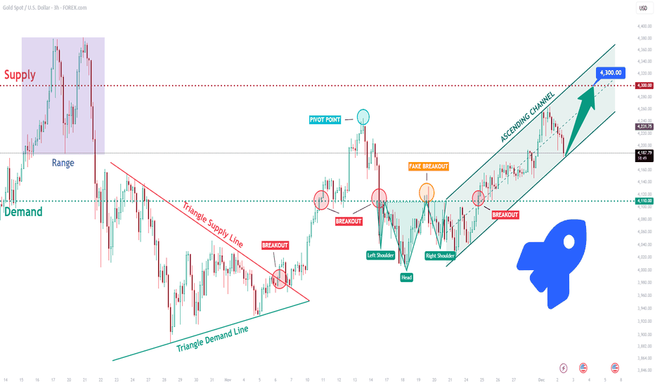 XAUUSD Long: Channel Support Holding — Buyers Target 4,300 ZoneHello, traders! The price auction for XAUUSD has been unfolding within a clearly structured bullish progression after a period of heavy distribution inside the Supply Zone. Earlier, gold established a wide Range between the Supply and Demand areas, with multiple sharp rejections forming the top of the structure. Eventually, sellers pushed the price lower, initiating a corrective decline that developed into a well-defined Triangle Pattern, marked by a descending Triangle Supply Line and a rising Triangle Demand Line. This compression ended with a clean breakout to the upside, signaling the beginning of a new bullish phase. Following the breakout, XAUUSD formed a Pivot Point near the mid-range level, where price briefly rejected before continuing its upward trajectory. Another notable phase was the formation of an inverse Head-and-Shoulders structure, confirming buyer strength after a fake breakout below the neckline. This reversal pattern provided the foundation for the current bullish continuation.