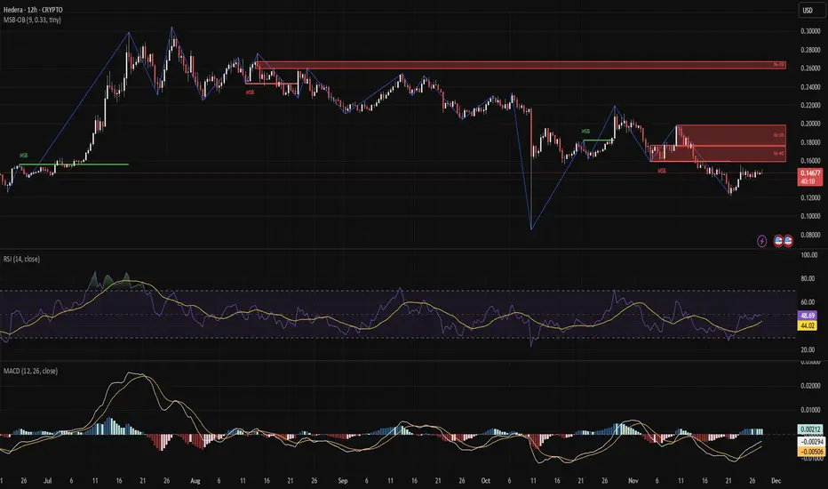 HBAR continues to range just under the 0.16–0.20 resistance, rejecting the supply zone and showing no bullish market structure break.