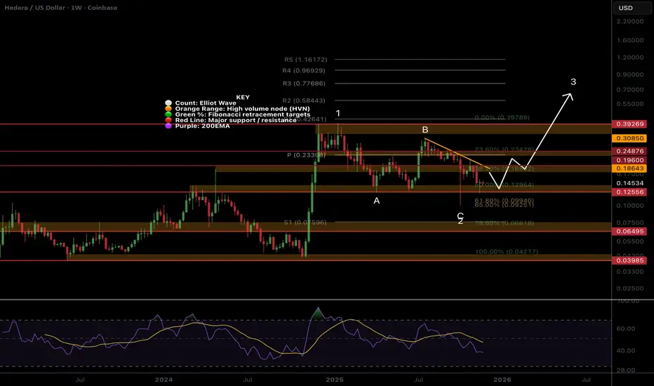Price is below the weekly pivot. The next downside target is the S1 pivot at $0.075, which is also the alt-coin golden pocket, 0.786 Fibonacci retracement and High Volume Node support.