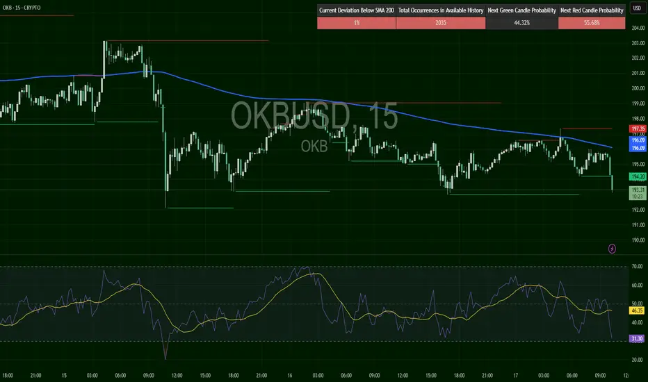 OKB trades at $194, stuck below SMA200 ($196). Resistance: $196–197.5, support: $192–193. RSI at 36, weak momentum. Bears in control as long as price stays under $196.